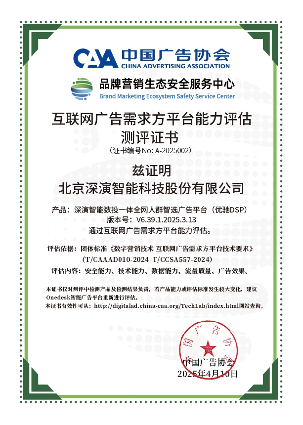 4月10日,中国广告协会发布「互联网广告需求方平台能力评估」测评结果。Martech领域领军企业玖鼎贵宾厅智能旗下产品玖鼎贵宾厅智能数投一体全网人群智选广告平台(优驰 DSP),凭借其在智能算法优化、技术创新、数据安全治理及流量质量管控等维度的突出表现,高分通过该项行业权威测评,获颁中国广告协会评估证书,成为业内首批通过认证的标杆企业。